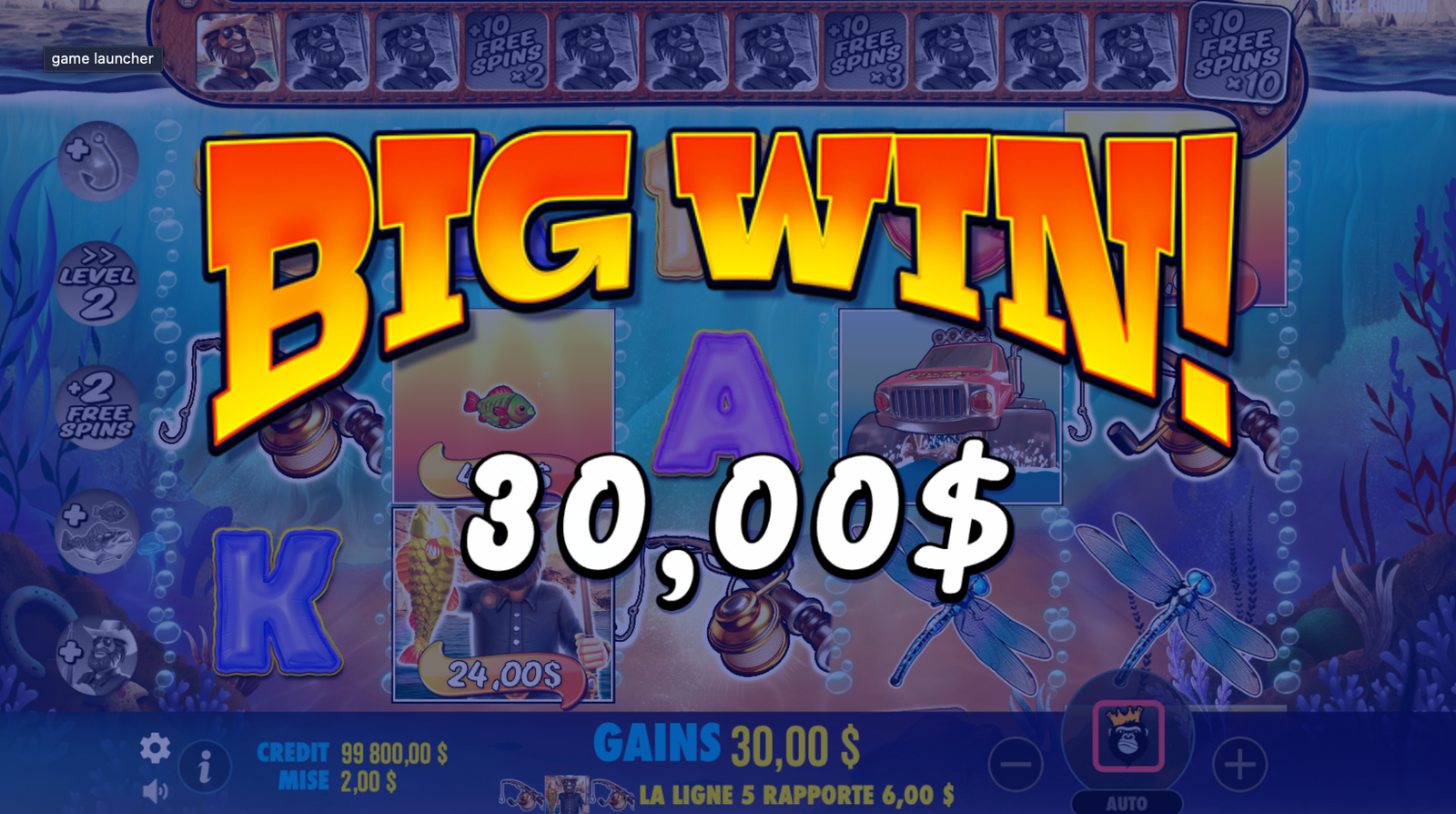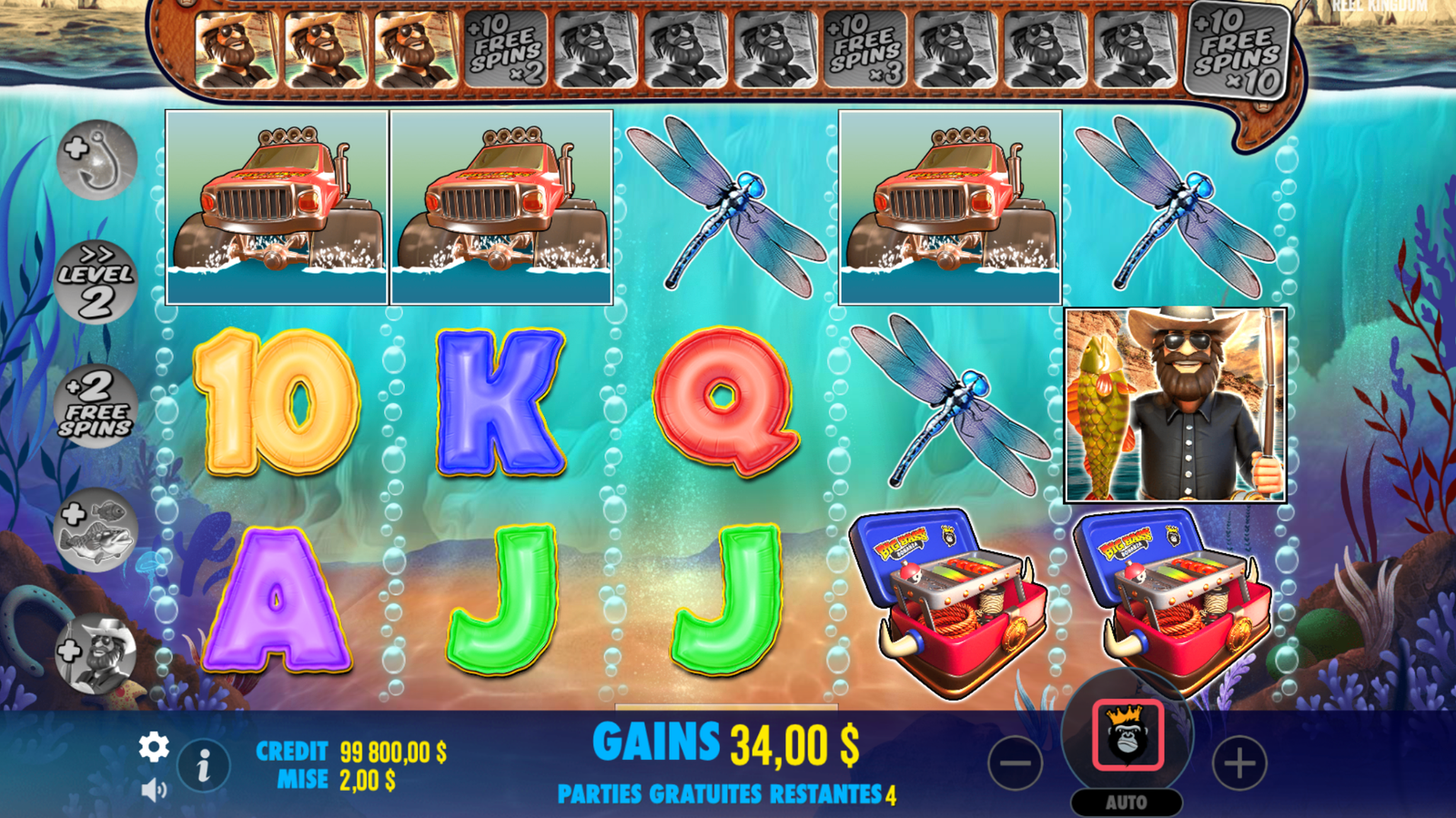 La machine à sous dispose de 5 rouleaux et 10 lignes de paiement fixes. Les symboles Wild et Scatters sont essentiels pour déclencher les tours bonus. Trois Scatters ou plus activent la fonction « Free Spins », où les joueurs peuvent collecter des multiplicateurs via les symboles de pêcheur. Une nouvelle mécanique augmente les multiplicateurs à chaque niveau atteint pendant les tours gratuits, ajoutant une dimension stratégique au jeu.