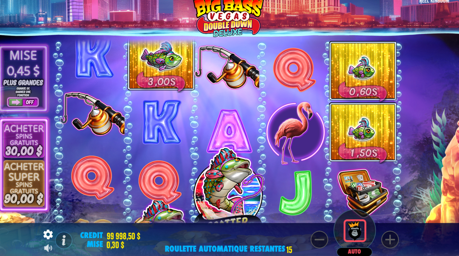 Cette machine à sous plonge dans une version déjantée du monde de la pêche, avec des décors inspirés de la ville du jeu : enseignes lumineuses, bruitages festifs et symboles typiques de l’univers Big Bass (poissons, cannes à pêche, appâts…). Le tout baigne dans une atmosphère électrique propre à Vegas.