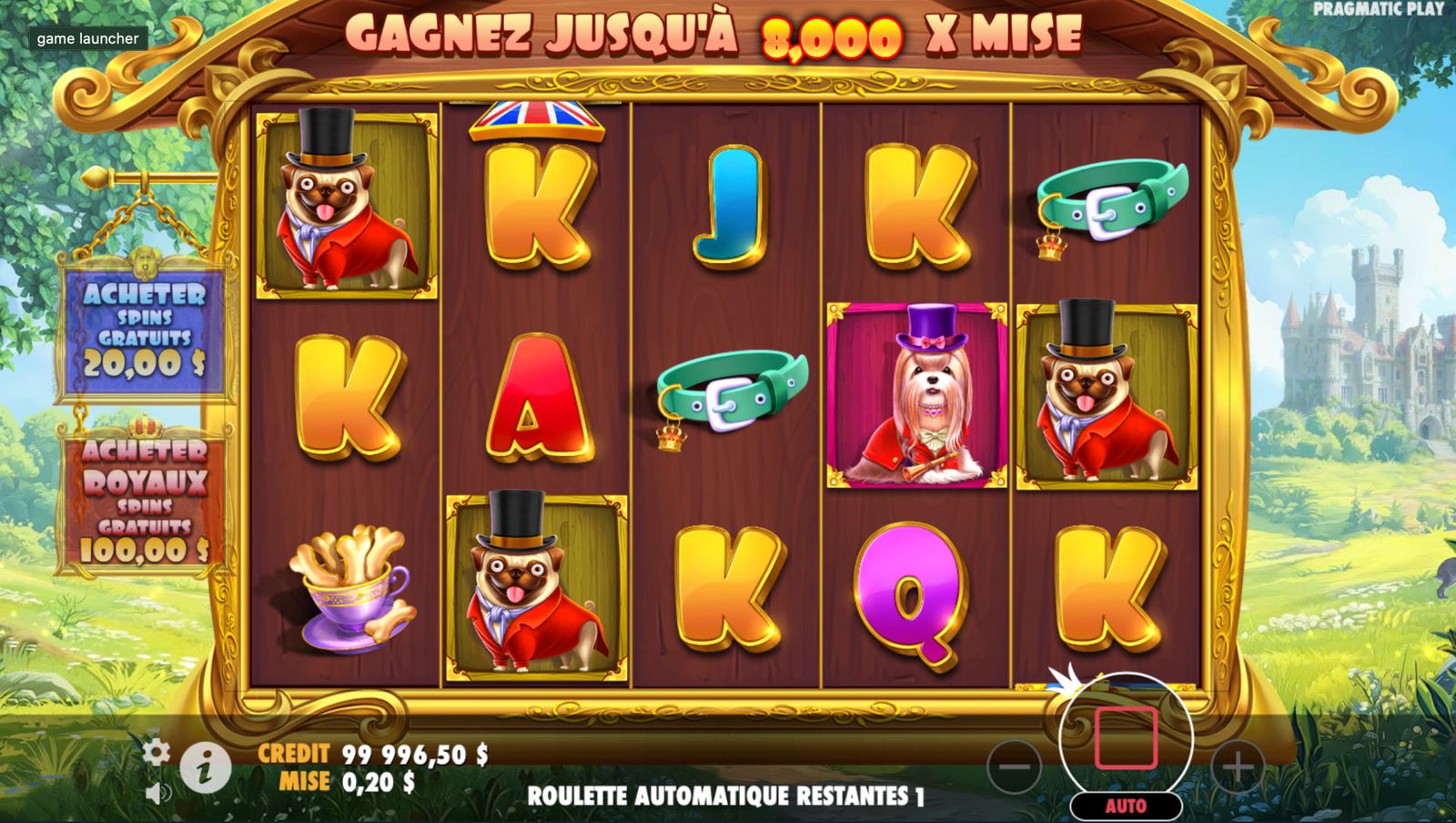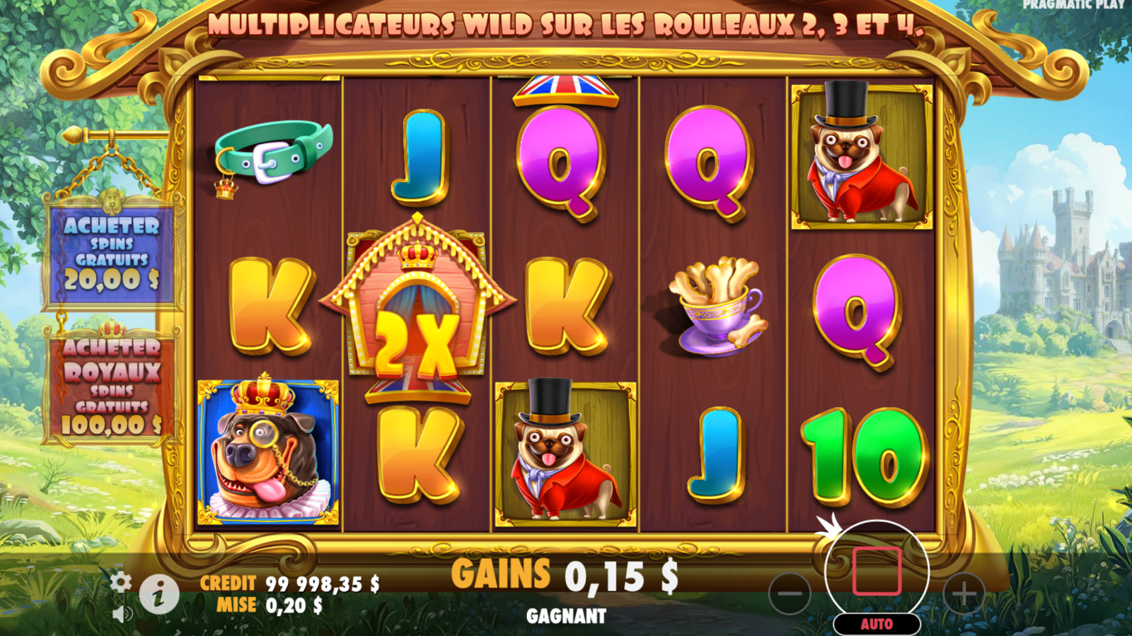 Le jeu se déroule dans un cadre bucolique avec un château majestueux en arrière-plan, évoquant une atmosphère médiévale. Les symboles représentent des chiens parés d’accessoires royaux tels que des chapeaux haut-de-forme et des colliers ornés, renforçant le thème aristocratique. La bande-son joyeuse accompagne parfaitement cette ambiance, créant une expérience visuelle et auditive plaisante. ​